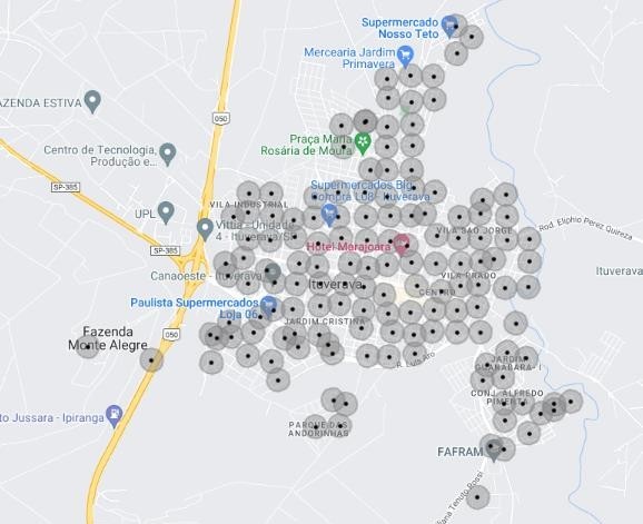 Cada ponto na cor preta representa uma armadilha instalada. Cada armadilha está instalada entre 250 a 300 metros uma da outra, respeitando critérios técnicos já pré definido.